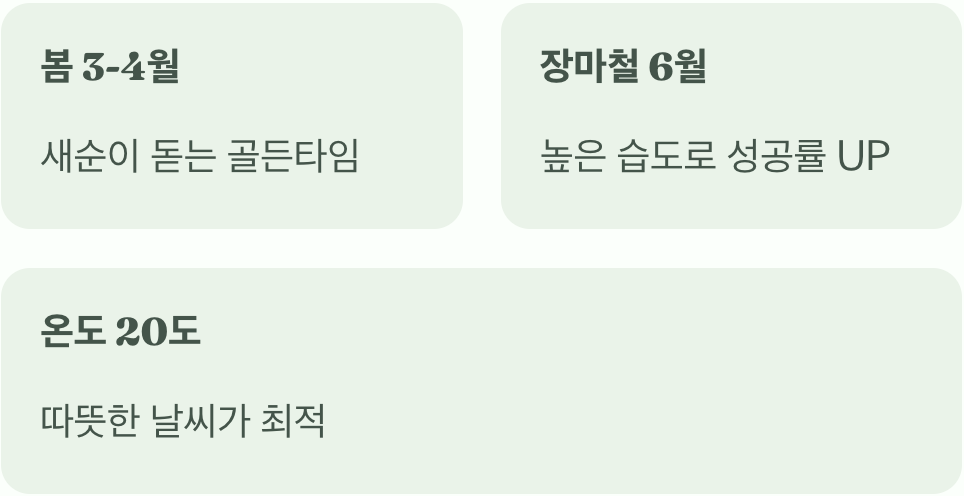 언제 시도하느냐에 따라 성공률이 달라집니다. 가장 좋은 골든타임은 새순이 돋아나기 시작하는 3월에서 4월 사이의 봄, 그리고 습도가 높은 6월 장마철입니다. 이때는 나무 자체의 성장 호르몬이 왕성하게 활동하는 시기라서 뿌리가 정말 빨리 내립니다.