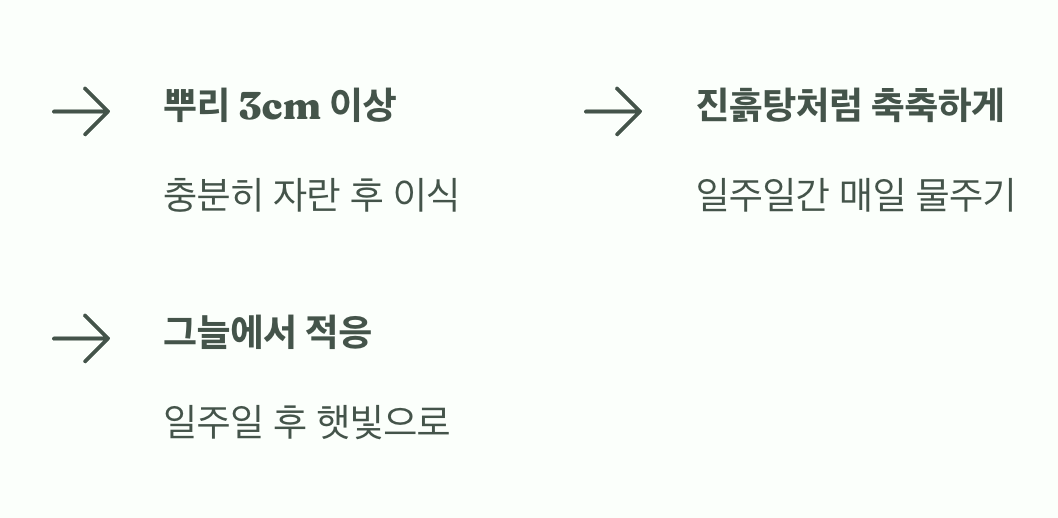 물속에서 하얀 뿌리가 3cm 이상 충분히 자랐다면 이제 흙으로 옮겨 심을 차례입니다. 이때가 가장 중요한 순간입니다. 물속에만 있던 뿌리가 거친 흙을 만나면 적응하느라 몸살을 앓기 쉽습니다. 해결책은 흙을 '진흙탕'처럼 아주 축축하게 유지해 주는 것입니다.