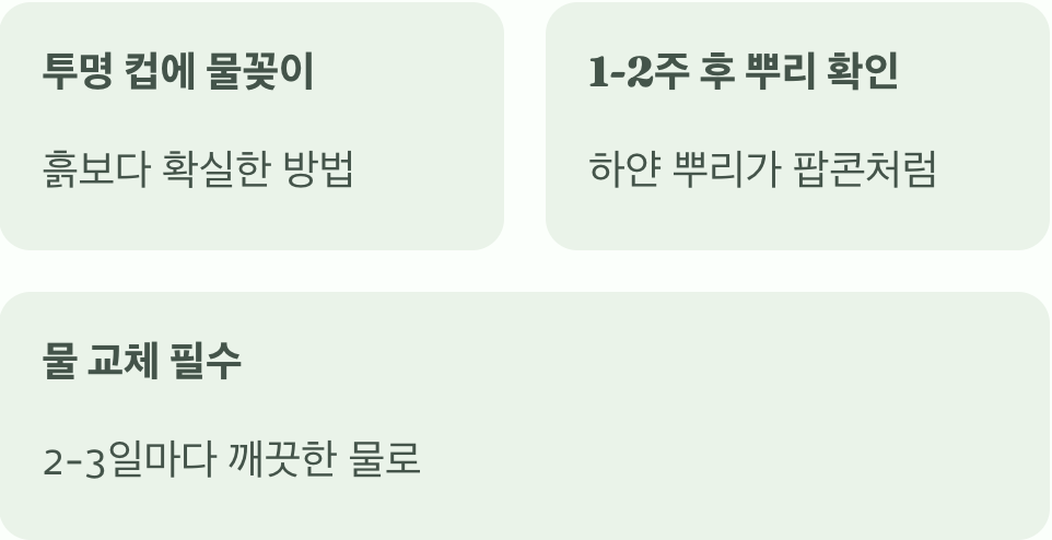 가지를 물에 담가두고 일주일에서 이주일 정도 기다리면 하얀색 뿌리가 팝콘처럼 터져 나오는 것을 눈으로 확인할 수 있습니다. 이때 물은 2~3일에 한 번씩 깨끗한 물로 갈아주어야 썩지 않습니다. 눈으로 뿌리가 자라는 과정을 보면서 안심할 수 있고, 뿌리가 충분히 나온 뒤에 흙으로 옮기면 생존율이 비약적으로 올라갑니다.