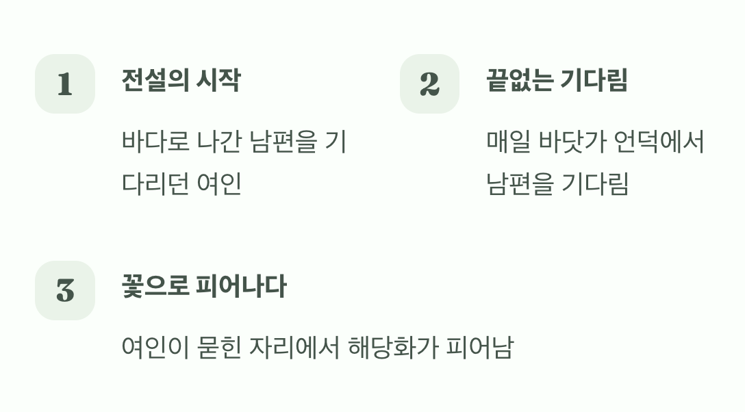 해당화에는 아름답지만 슬픈 전설이 깃들어 있습니다. 아주 먼 옛날, 바다로 나간 남편을 애타게 기다리던 한 여인이 있었습니다. 그녀는 매일같이 바닷가 언덕에 올라 남편이 돌아오기만을 기다렸지만, 남편은 끝내 돌아오지 않았고, 기다림에 지친 여인은 그 자리에서 숨을 거두고 말았습니다. 그 후, 그녀가 묻힌 자리에서 피어난 꽃이 바로 해당화라는 이야기입니다.