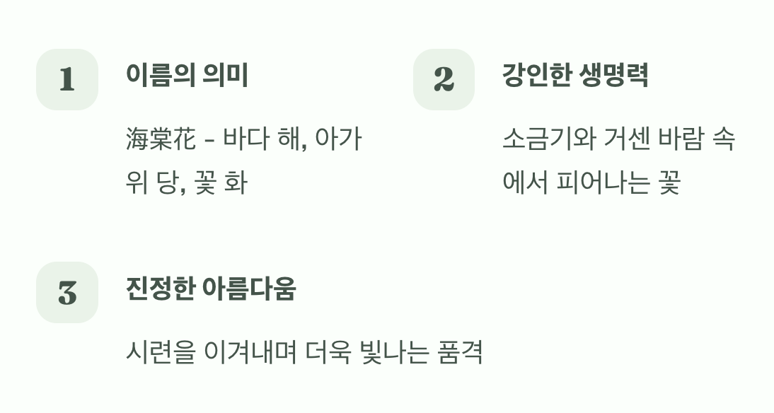장미과에 속하기 때문에 ‘바닷가의 장미’라는 아름다운 별명을 가지고 있지만, 온실 속 화려한 장미와는 그 품격이 다릅니다. 척박한 환경 속에서도 짙은 향기와 고운 자태를 잃지 않는 그 모습. 이는 우리에게 진정한 아름다움은 편안한 환경이 아닌, 시련을 이겨내는 과정 속에서 더욱 빛난다는 중요한 사실을 일깨워 줍니다.