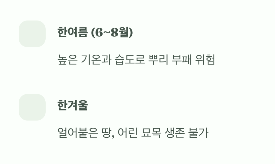 반대로 절대로 피해야 할 시기는 바로 한여름과 한겨울입니다. 6월부터 8월 사이의 여름은 기온이 너무 높고 장마로 인해 습도가 높습니다. 이때 나무를 옮겨 심으면 뿌리가 숨을 쉬지 못해 썩어버리거나, 잎에서 수분이 너무 빨리 증발해 말라 죽기 쉽습니다. 사람도 더운 날 이사하면 힘들 듯이 나무도 마찬가지입니다.
