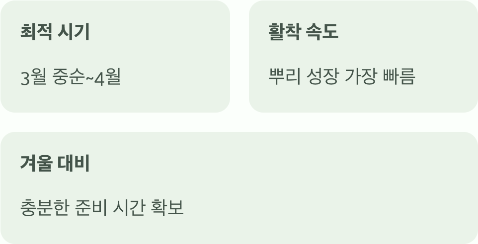 봄에 심는 것의 가장 큰 장점은 다가올 겨울을 대비할 시간이 충분하다는 것입니다. 봄, 여름, 가을을 지나며 튼튼하게 뿌리를 내린 나무는 매서운 겨울 추위가 와도 거뜬히 버텨낼 수 있는 힘을 갖게 됩니다. 만약 묘목을 구입할 계획이라면 늦서리가 끝나고 새순이 너무 많이 나오기 직전인 이른 봄을 놓치지 마세요. 일 년 농사의 성공을 결정짓는 가장 안전한 해결책입니다.