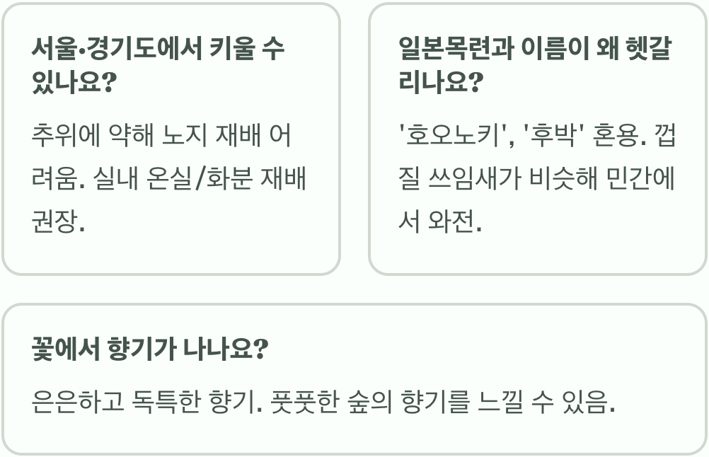 A. 일본목련의 일본 이름이 '호오노키'인데, 껍질을 약재로 쓸 때 한약명인 '후박'을 빌려 쓰면서 와전되었다는 설이 있습니다. 또한 껍질의 쓰임새가 비슷해서 민간에서 혼용되어 불리다 보니 이름이 굳어진 경우가 많습니다.