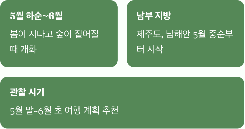 봄바람이 지나가고 날씨가 조금씩 더워지기 시작하는 5월 하순이 되면 이 나무는 꽃피울 준비를 마칩니다. 벚꽃이나 진달래처럼 봄의 시작과 함께 화려하게 터지는 것이 아니라, 숲이 온통 초록색으로 짙어질 무렵 조용히 자신의 존재감을 드러냅니다. 남해안이나 제주도 같은 따뜻한 곳에서는 5월 중순부터 꽃망울이 터지기 시작하여 6월까지 이어집니다.
