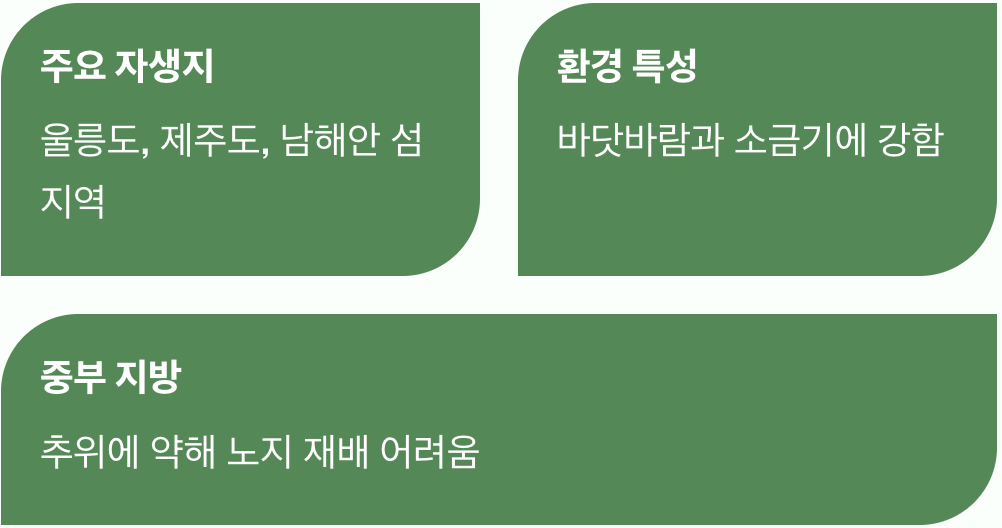 이 친구는 추위에 약해서 주로 따뜻한 남쪽 나라에서 잘 자랍니다. 우리나라에서는 울릉도와 제주도, 그리고 남해안의 섬 지역이 주요 자생지입니다. 바닷바람을 맞으며 자라는 것을 좋아하고 소금기에도 강해서 해안가의 방풍림으로도 많이 심어집니다. 내륙 깊숙한 곳이나 추운 서울 지방의 야외에서는 겨울을 나기가 어려워 쉽게 보기 힘듭니다.