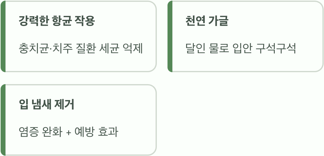 나이가 들수록 치아보다 더 걱정되는 것이 바로 잇몸 건강입니다. 양치질할 때 피가 나거나 잇몸이 내려앉는 느낌이 든다면 구강 내 유해 세균을 잡아야 합니다. 이 식물에는 강력한 항균 작용을 하는 성분이 들어있어서 충치 균이나 치주 질환을 일으키는 세균을 억제하는 데 큰 도움을 줍니다. 시중에 판매되는 유명한 잇몸약의 원료로도 사용될 만큼 그 효능은 이미 입증되었습니다.