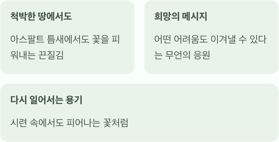 이러한 모습 때문에 ‘강인함’과 ‘감사하는 마음’이라는 꽃말도 함께 가지고 있습니다. 힘든 시기를 겪고 있는 친구나 가족에게 ‘어떤 어려움도 이겨낼 수 있다’는 무언의 응원을 보내고 싶을 때, 흰민들레는 그 자체로 강력한 희망의 메시지가 됩니다. 시련 속에서도 피어나는 꽃처럼, 당신도 다시 일어설 수 있다는 용기를 선물해 보세요.