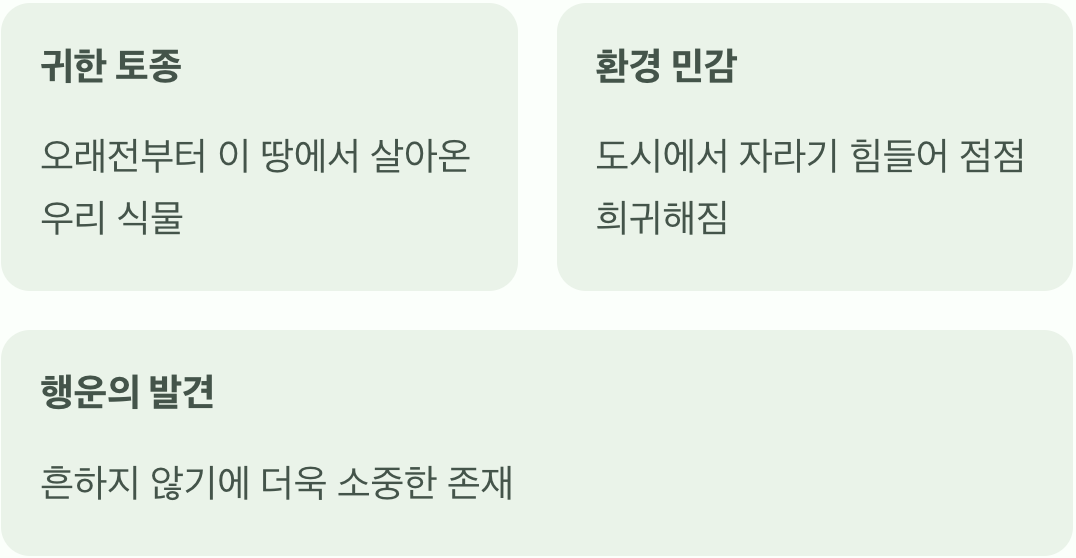우리가 흔히 보는 노란 민들레는 대부분 서양에서 건너온 외래종입니다. 번식력이 워낙 강해서 어디서든 잘 자라죠. 반면에 흰민들레는 아주 오래전부터 이 땅에서 살아온 우리의 토종 식물입니다. 하지만 환경 변화에 예민하고 도시에서는 자라기 힘들어 점점 보기 귀한 꽃이 되어가고 있습니다.